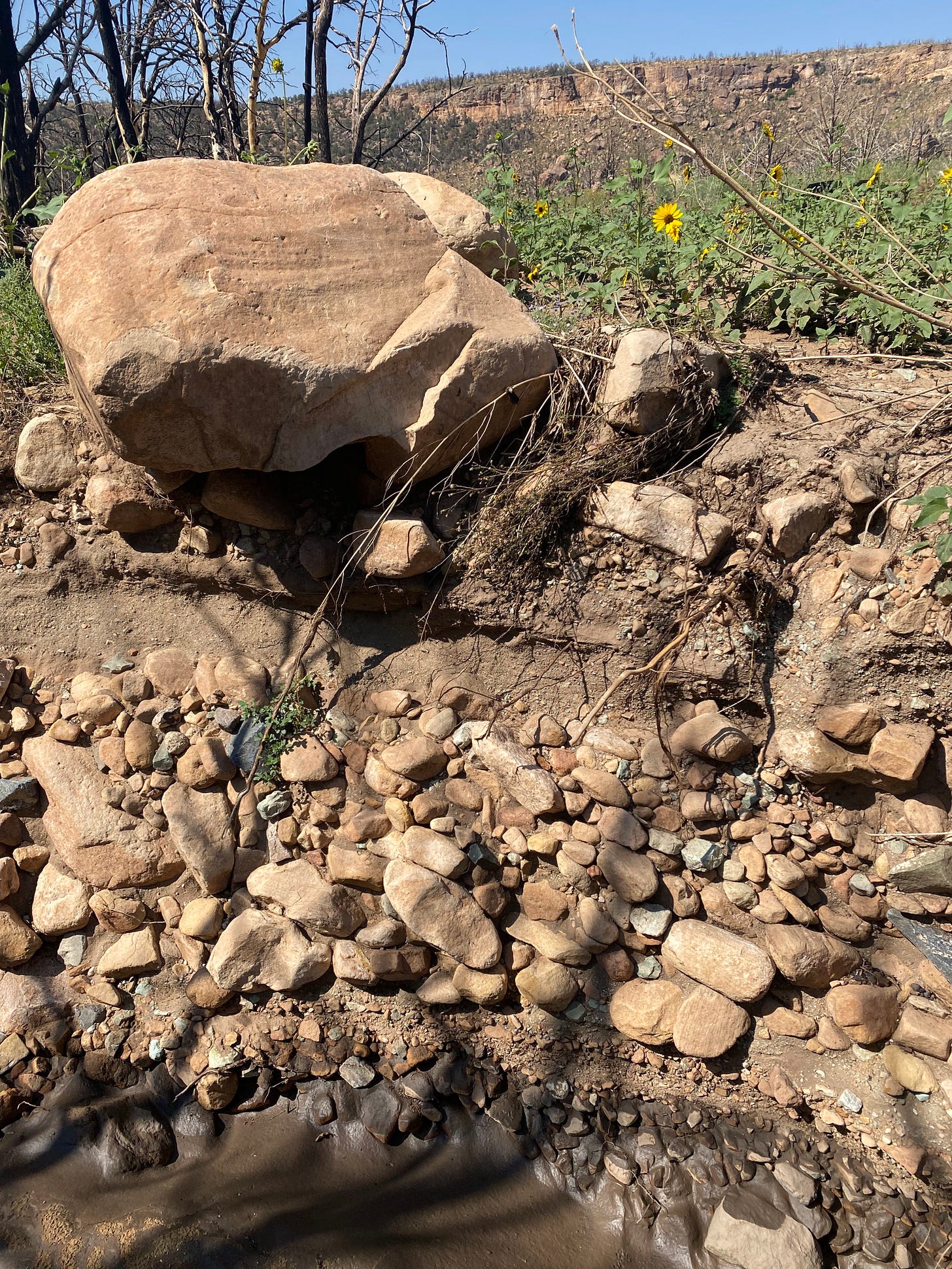 *A lovely cobbly soil profile with layers of rounded rocks and sediment moved by flowing water, found while running near Nucla, Colorado.*