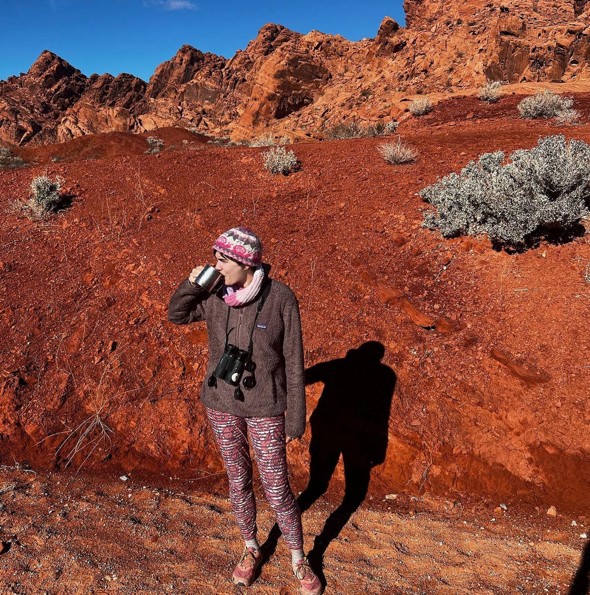 *Me, looking for soils and birds while enjoying a cup of coffee in the desert earlier this year.*