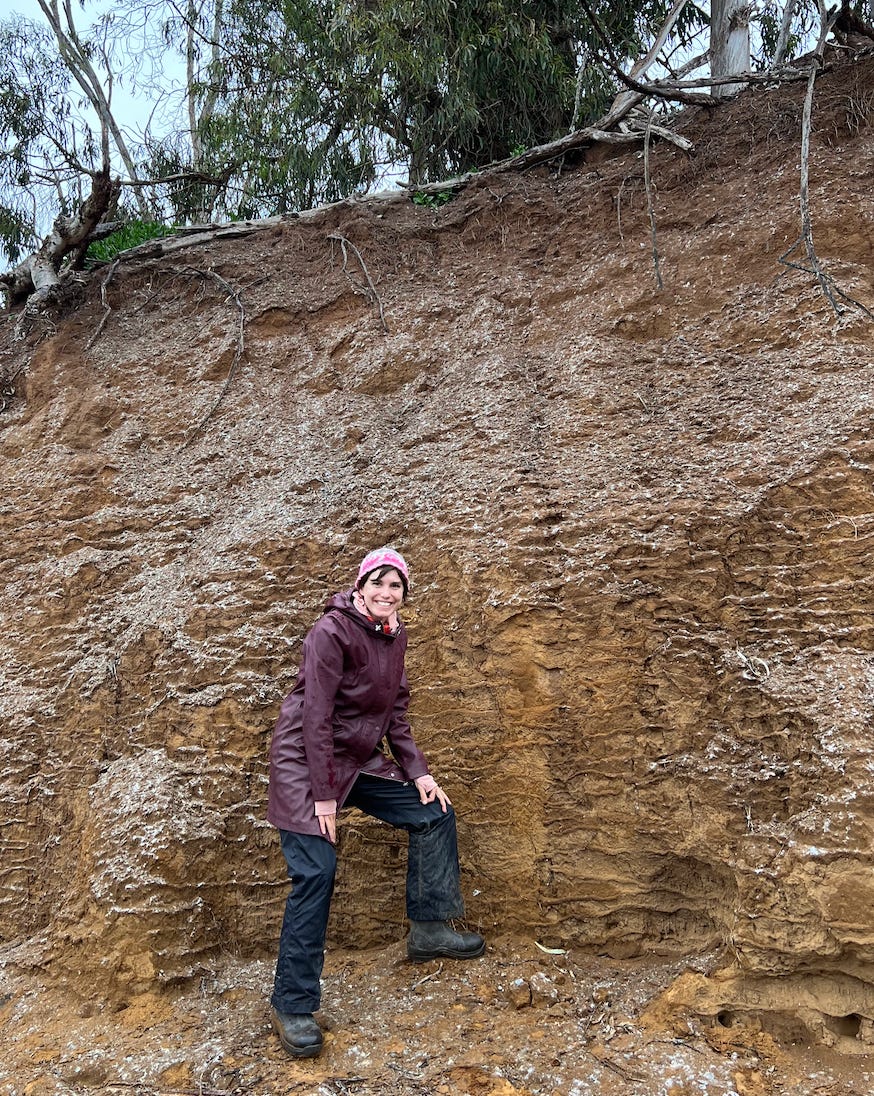 *Me again, very excited to be showing this soil (filled with lamellae and covered in bird guano) to students on a field trip during my winter quarter soil morphology class in 2023.*